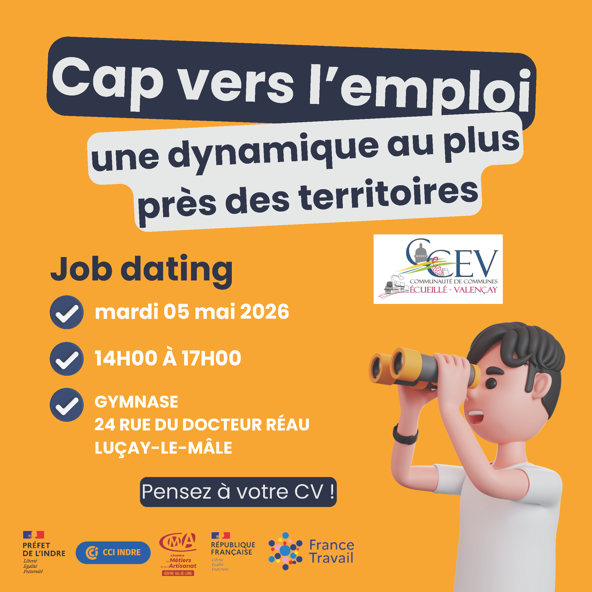 Mardi 5 mai 2026 de 14h à 17h au Gymnase de Luçay-le-Mâle (sous la salle des fêtes). À la recherche d’un emploi ou curieux de découvrir les entreprises du territoire ? Venez rencontrer directement des recruteurs et découvrir de nombreuses opportunités ! Pensez à venir avec votre CV ! Entreprises, recrutez localement ! Vous avez des besoins en recrutement ? Contactez le service Dev éco : mission2@ccev.fr / 02 54 00 34 57