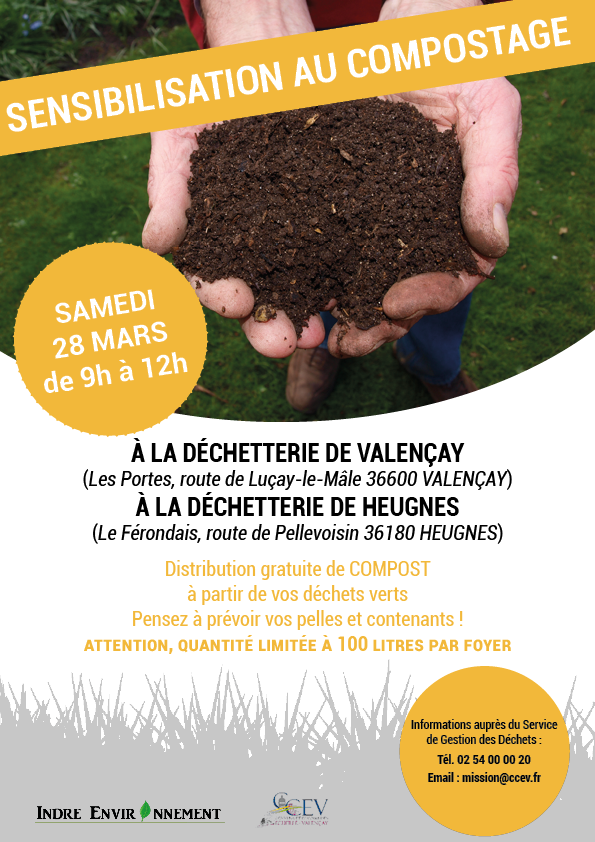 La CCEV vous propose une distribution gratuite de compost.Rendez-vous le samedi 28 mars 2026 de 9h à 12h à la déchetterie de Valençay ou de Heugnes. Pensez à prévoir vos pelles et contenants. La quantité est limitée à 100 litres/foyer.