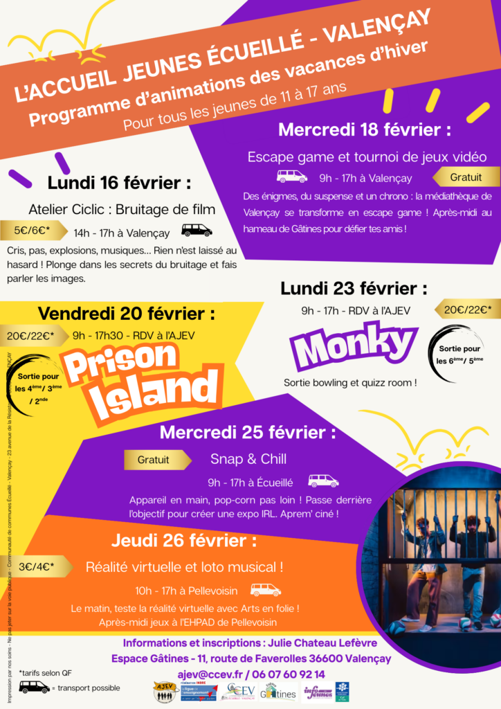 Tous les adolescents de 11 à 17 ans, résidents ou scolarisés sur l’une des communes de la CCEV, peuvent bénéficier de l’accompagnement de l’Accueil Jeunes Ecueillé – Valençay (AJEV) et participer aux actions proposées par la structure. Service en partenariat avec la FOL (Fédération des Oeuvres Laïques).