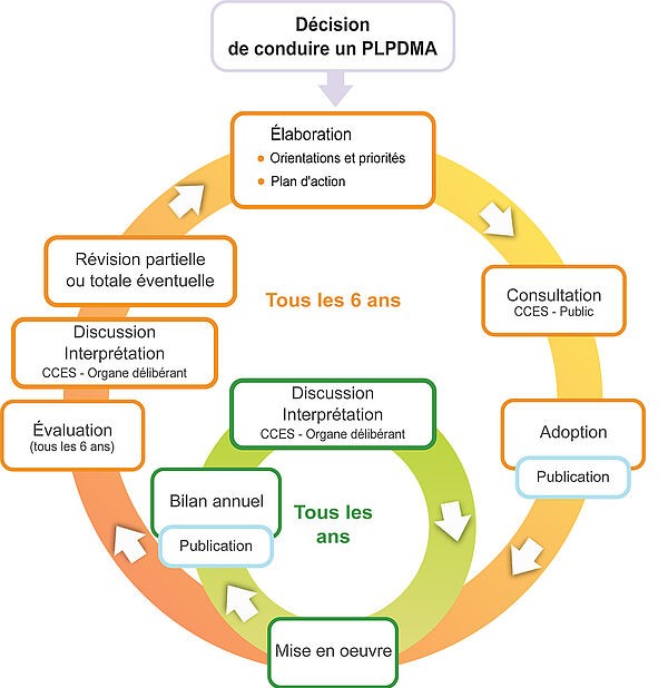 Le décret n° 2015-662 du 10 juin 2015 cadre le contenu et les modalités d’élaboration des PLPDMA. Il est codifié aux articles R541-41-19 à 28 du code de l’Environnement.